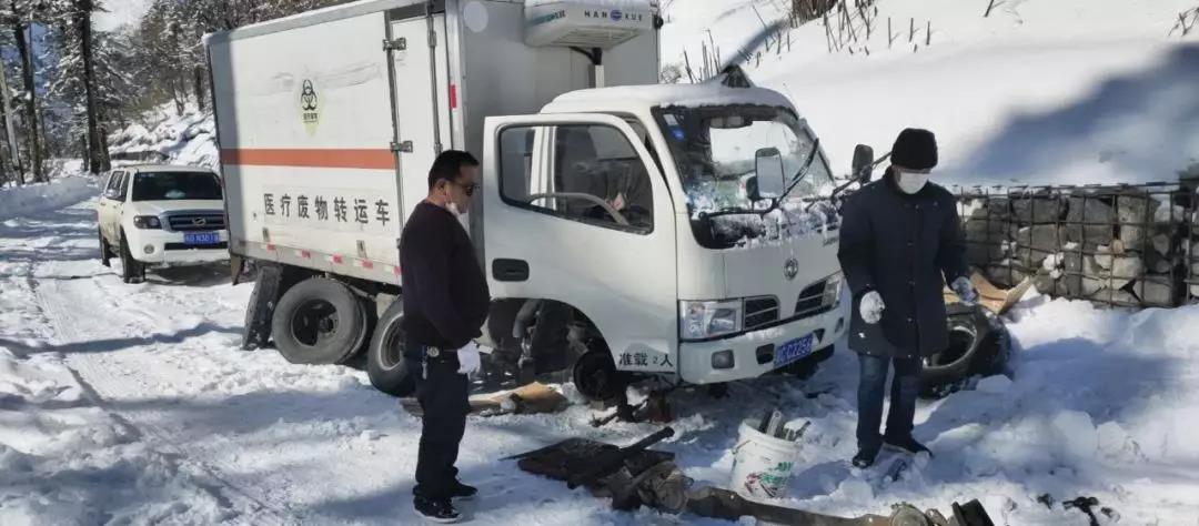 圖為國(guó)策環(huán)保醫(yī)療廢物轉(zhuǎn)運(yùn)車在轉(zhuǎn)運(yùn)醫(yī)療垃圾途中,因天氣惡劣車體打滑故障,車輛被困,正在進(jìn)行維修。